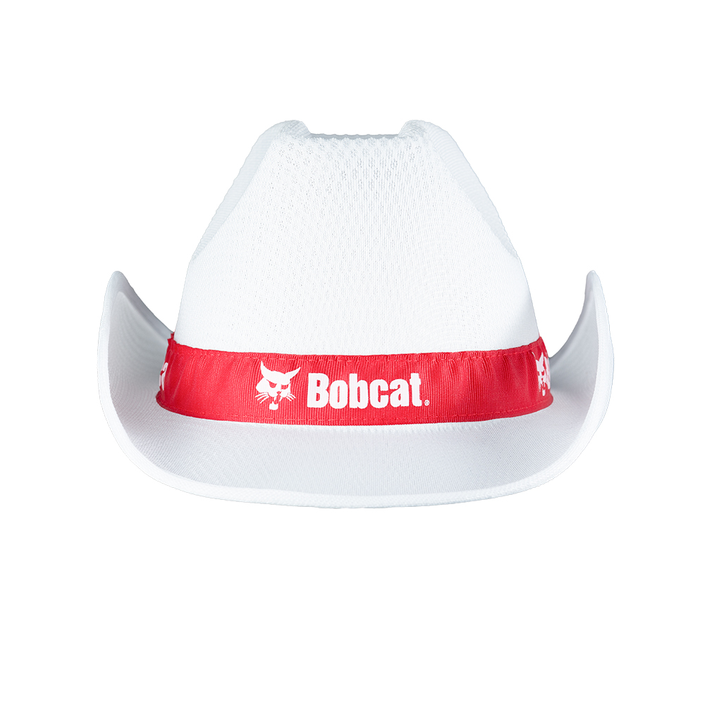Promotional white hat, cowboy shape with printed Bobcat logo red ribbon.