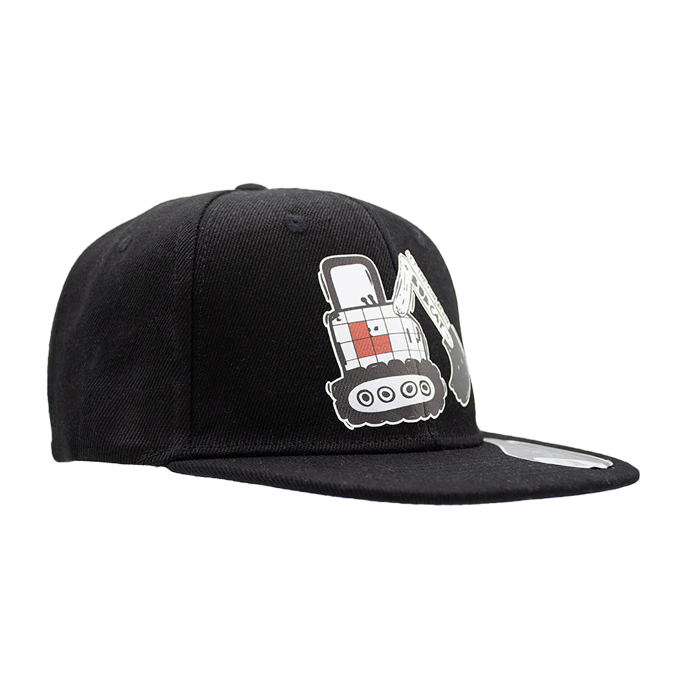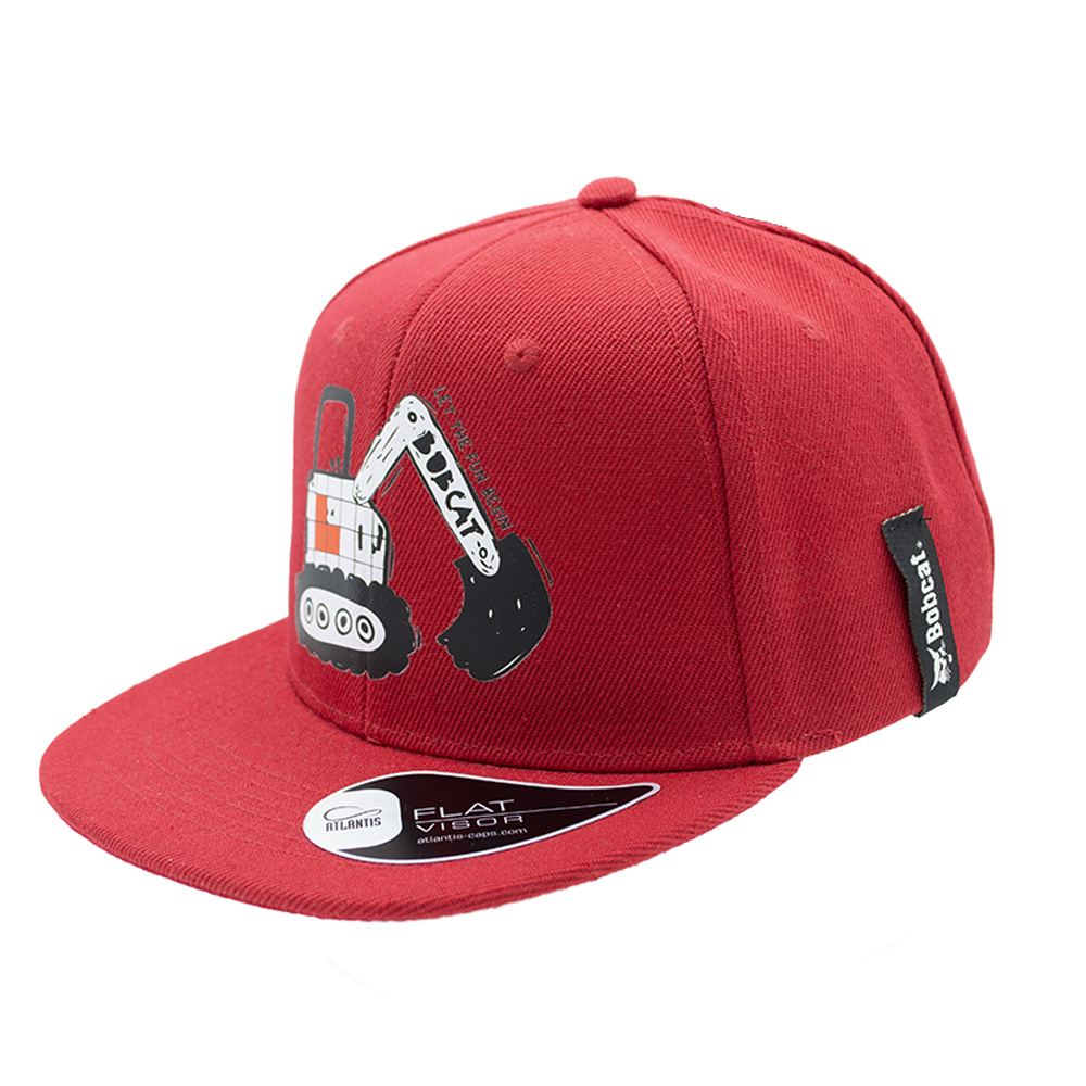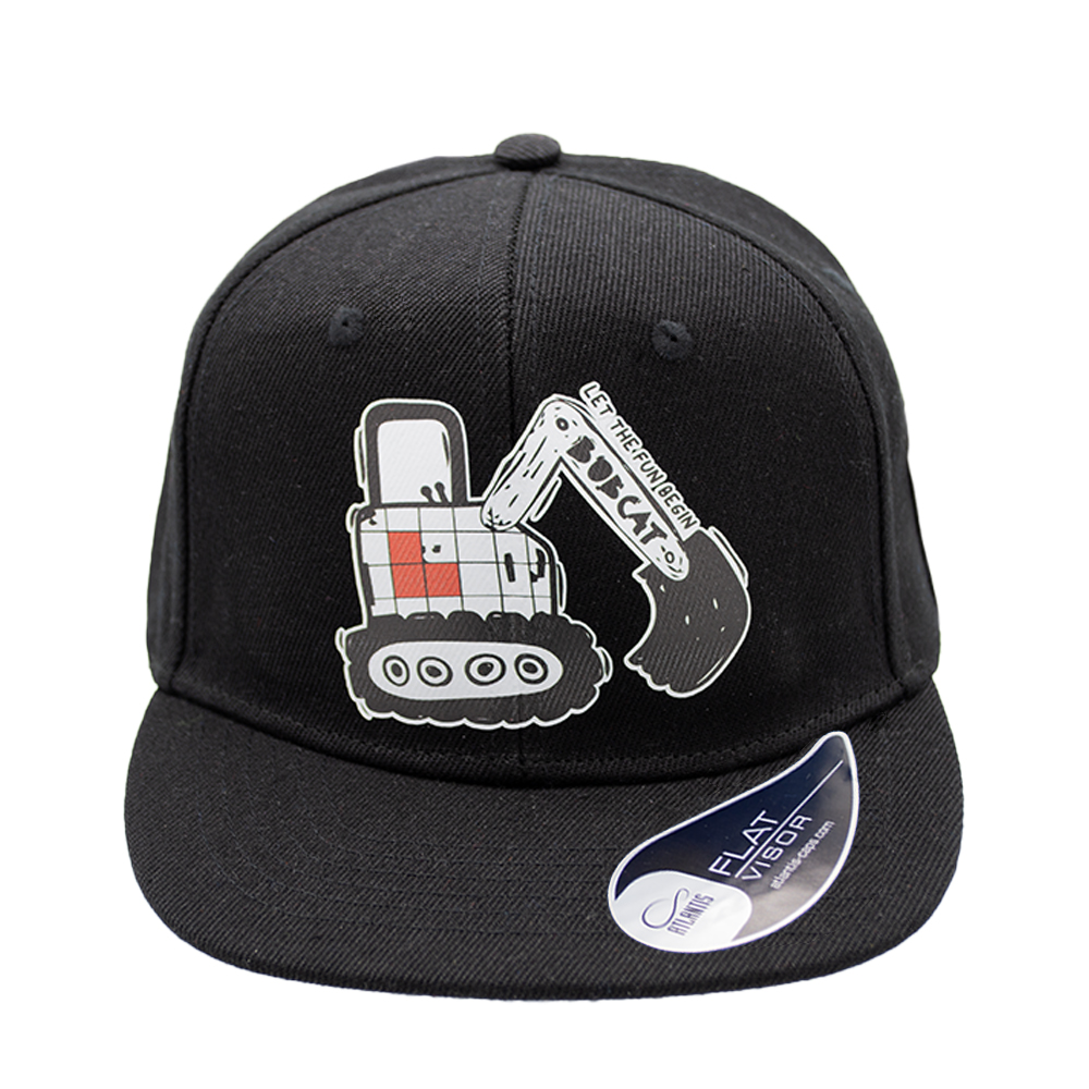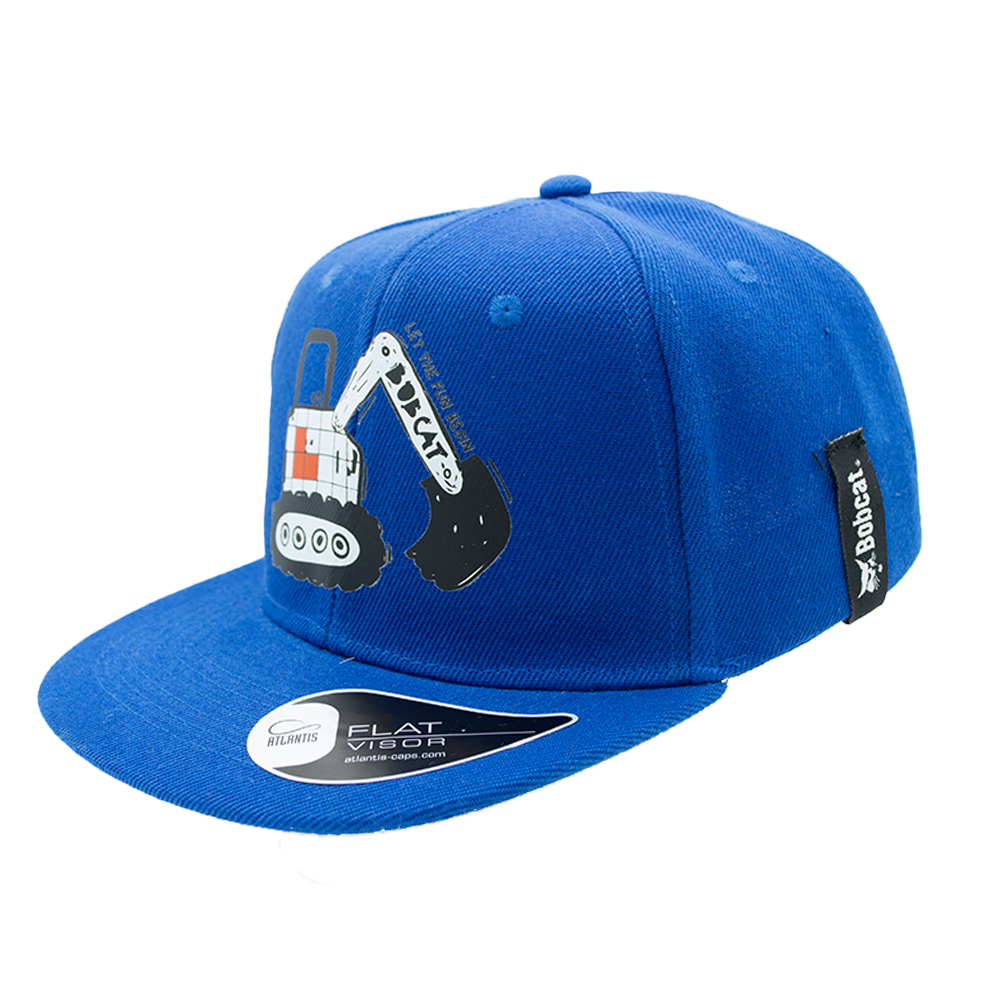 Kids flatpeak cap 100% acrylic. 6 panels cap (54 cm) with PVC snap closure, structured front panels, flat visor, 6 sewn eyelets, sweatband 35% cotton, 65% polyester, 6 rows on visor. Customised with kid design print and side woven label.
